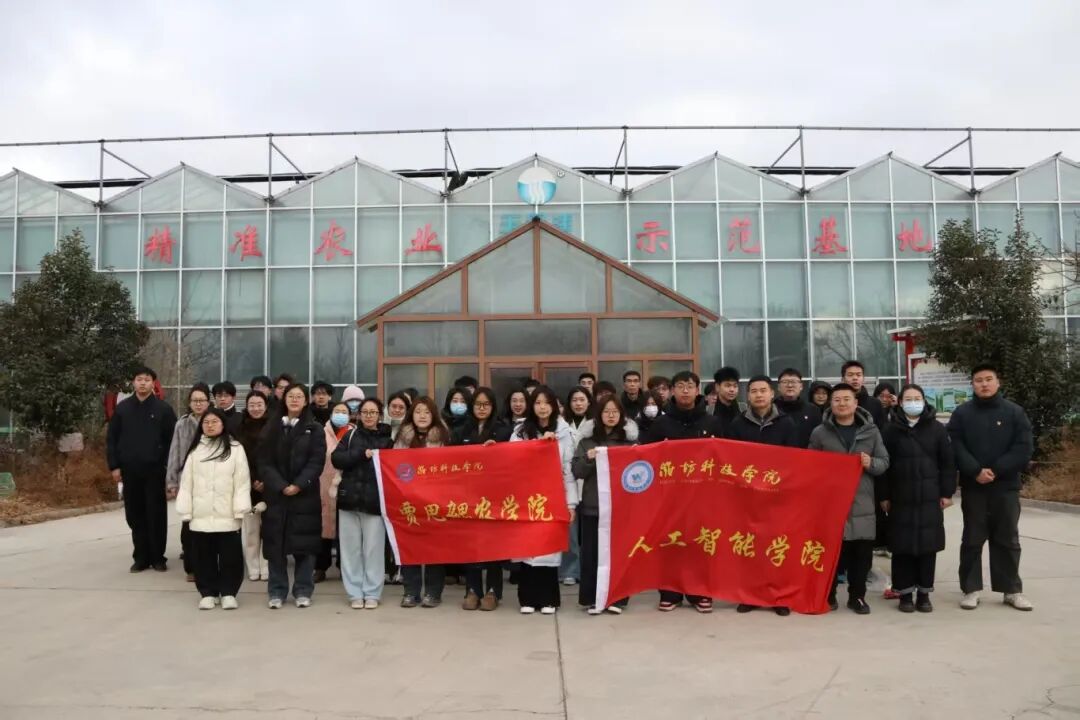 在“精准农业示范基地”前,两院师生整齐列队,红色院旗与基地标识相映成辉。作为农业与人工智能交叉融合的实践载体,该基地既承载着现代农业的技术成果,也为师生搭建了“AI+农业”的落地场景,让学科协同从课堂延伸至田间地头,为后续产学研结合埋下伏笔。