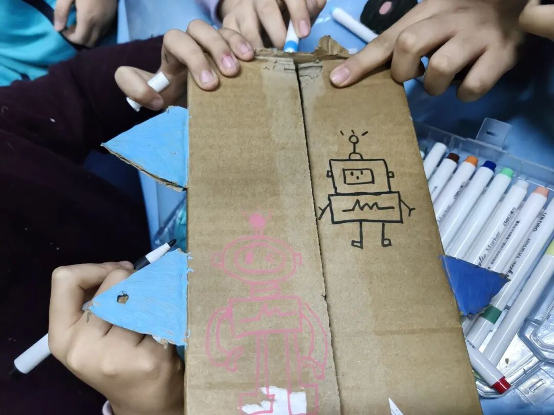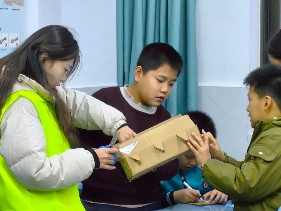 孩子们根据分组情况领取可回收废弃物及手工工具,志愿者展示AI提供的创意设计方案,包括笔筒、装饰品、简易机器人等制作范例,鼓励孩子们发挥想象力进行个性化创作。创作过程中,志愿者巡回指导,帮助孩子们解决裁剪、粘贴等操作难题,引导他们合理利用材料。活动尾声,组织全体孩子进行作品展示,每个小组派代表介绍自己的作品名称、制作材料及设计理念,志愿者对孩子们的创意和动手能力给予肯定和表扬。