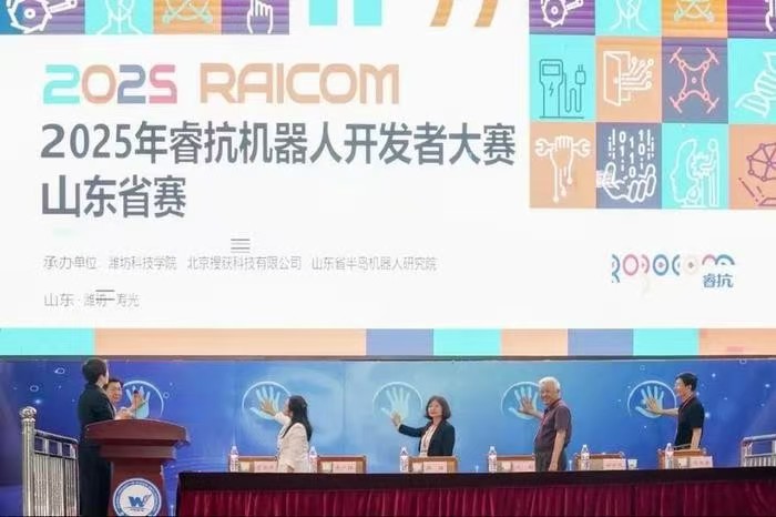 5月17日,2025年睿抗机器人开发者大赛(RAICOM)山东省赛在潍坊科技学院举行。睿抗机器人开发者大赛组委会副秘书长洪婕、巩彬,潍坊科技学院党委委员、副校长,睿抗机器人开发者大赛山东省赛组委会副主任李广伟,北京科技大学教授、博士生导师,睿抗机器人开发者大赛山东省赛组委会仲裁委员会负责人郗安民,山东大学教授、博士生导师,睿抗机器人开发者大赛山东省赛组委会专家委员会负责人周风余参加。潍坊科技学院党委委员、教务处处长董金萍主持开幕式。
