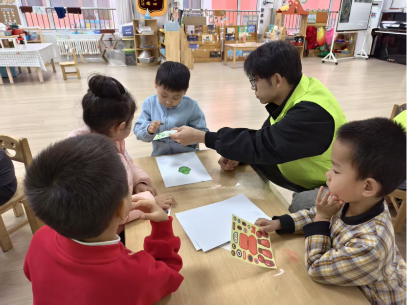 随后的机器人贴纸环节更是让活动氛围达到高潮。志愿者为孩子们分发机器人拼图贴纸和预设轮廓模板,孩子们化身 “小小工程师”,对照图示将不同功能的部件贴纸一一粘贴。从 “眼睛” 到 “手臂”,从 “身体” 到 “轮子”,抽象的人工智能部件变成了看得见、摸得着的具象图案,孩子们不仅完成了专属的 “机器人组装”,更在动手过程中建立起对 AI 构成要素的基础认知。