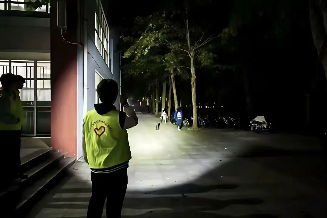 夜间巡逻期间,车辆引导志愿者们全员到岗,在教学楼东侧较昏暗区域提前做好照明工作,礼貌劝导文明停车,认真、耐心引导同学们车辆整齐停放。教学楼周边秩序始终焕然一新。