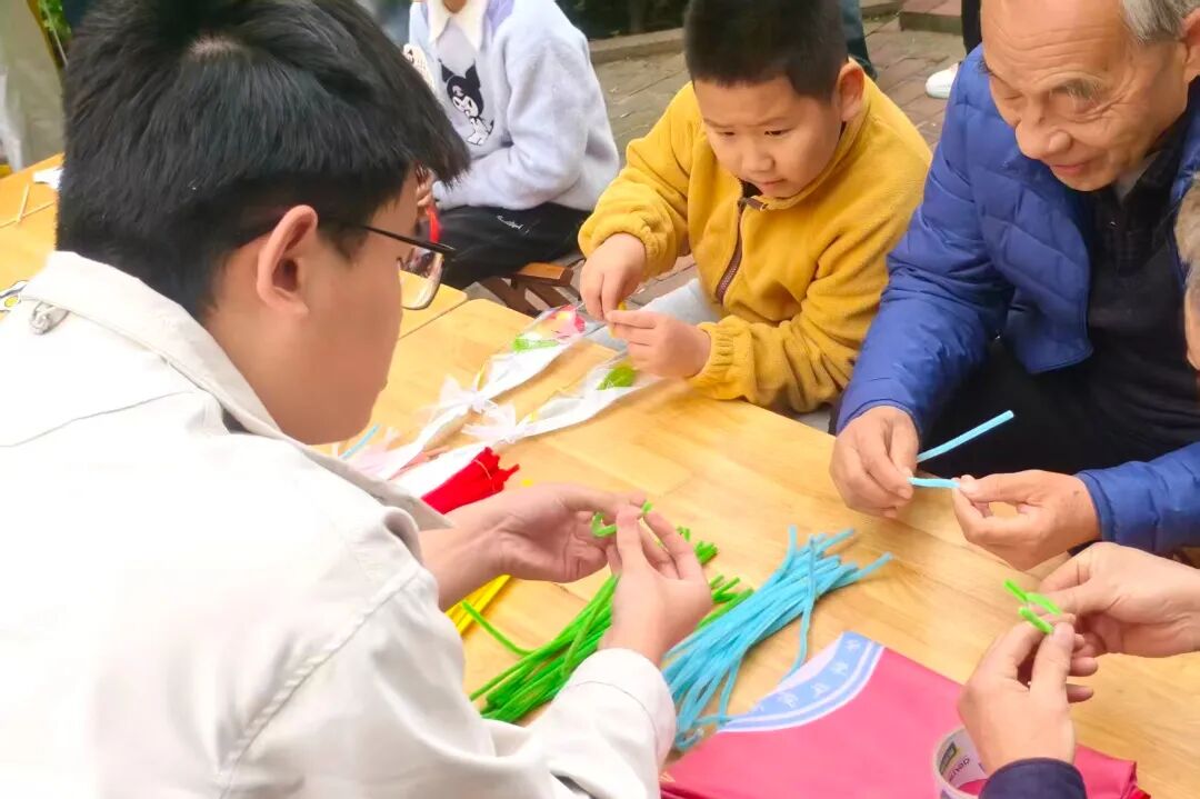活动现场,志愿者聚焦社区老少群体,细致讲解扭扭棒技巧,从基础造型到创意装饰,手把手指导完成花朵、手环等作品。